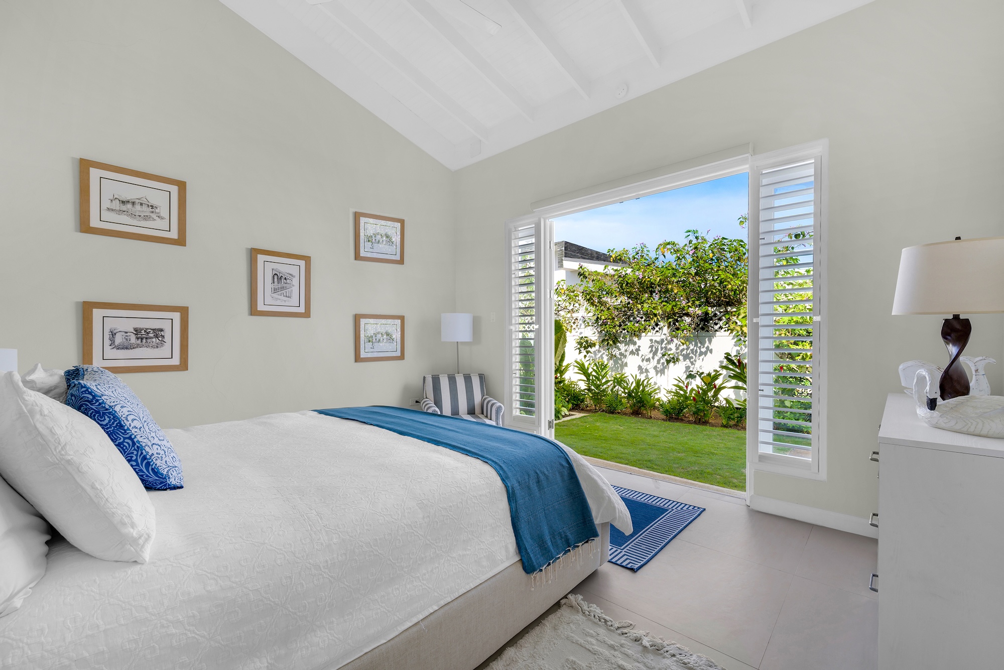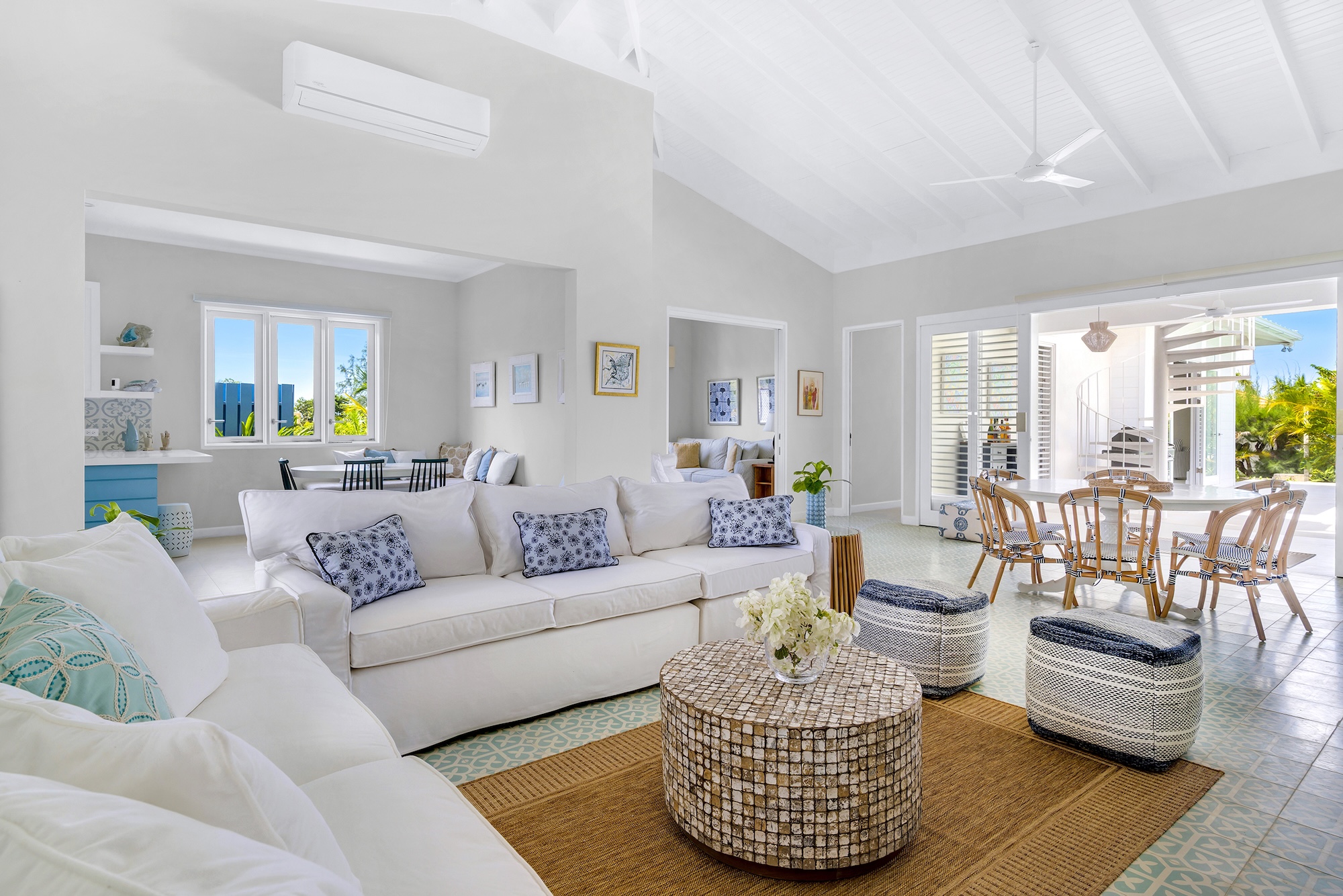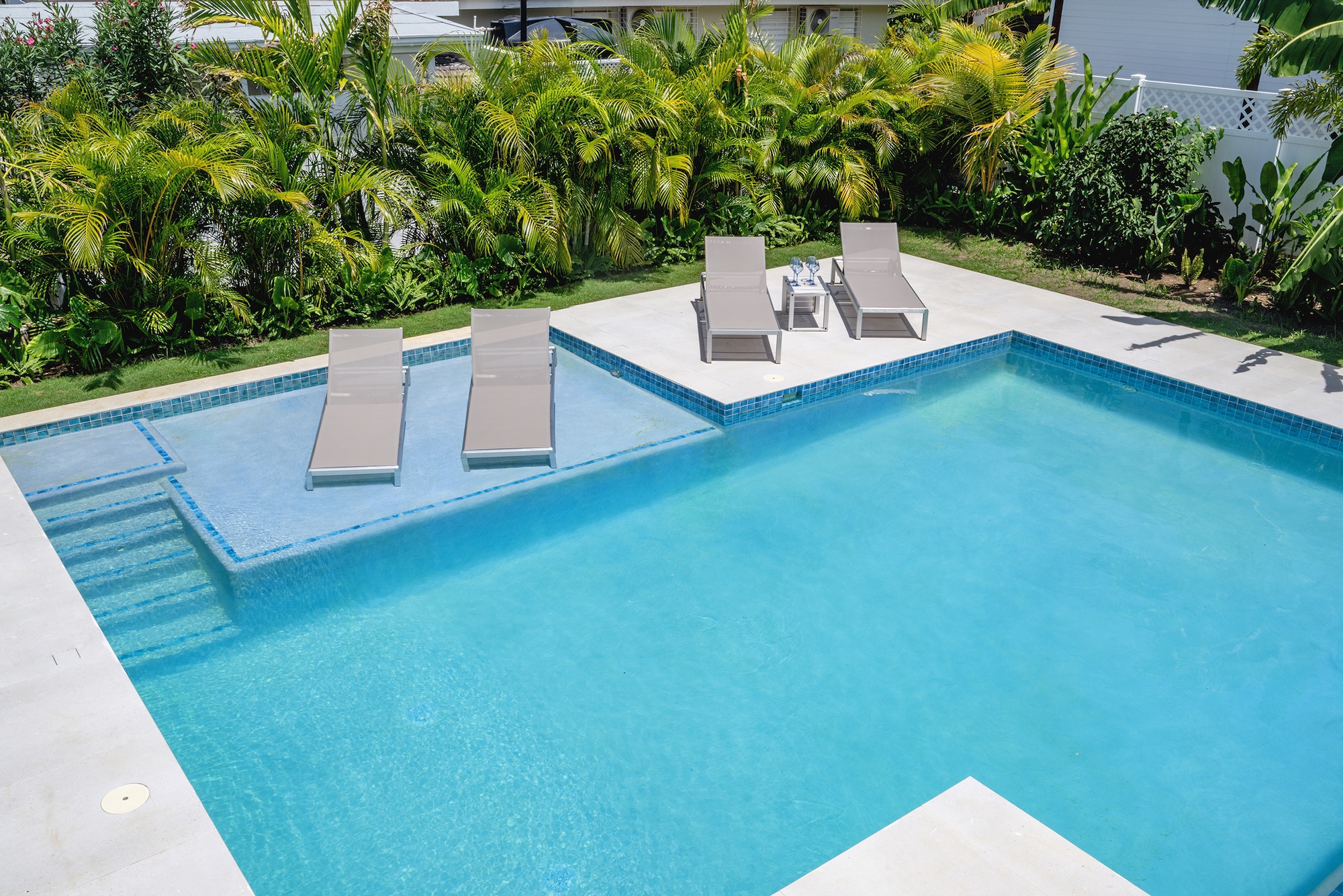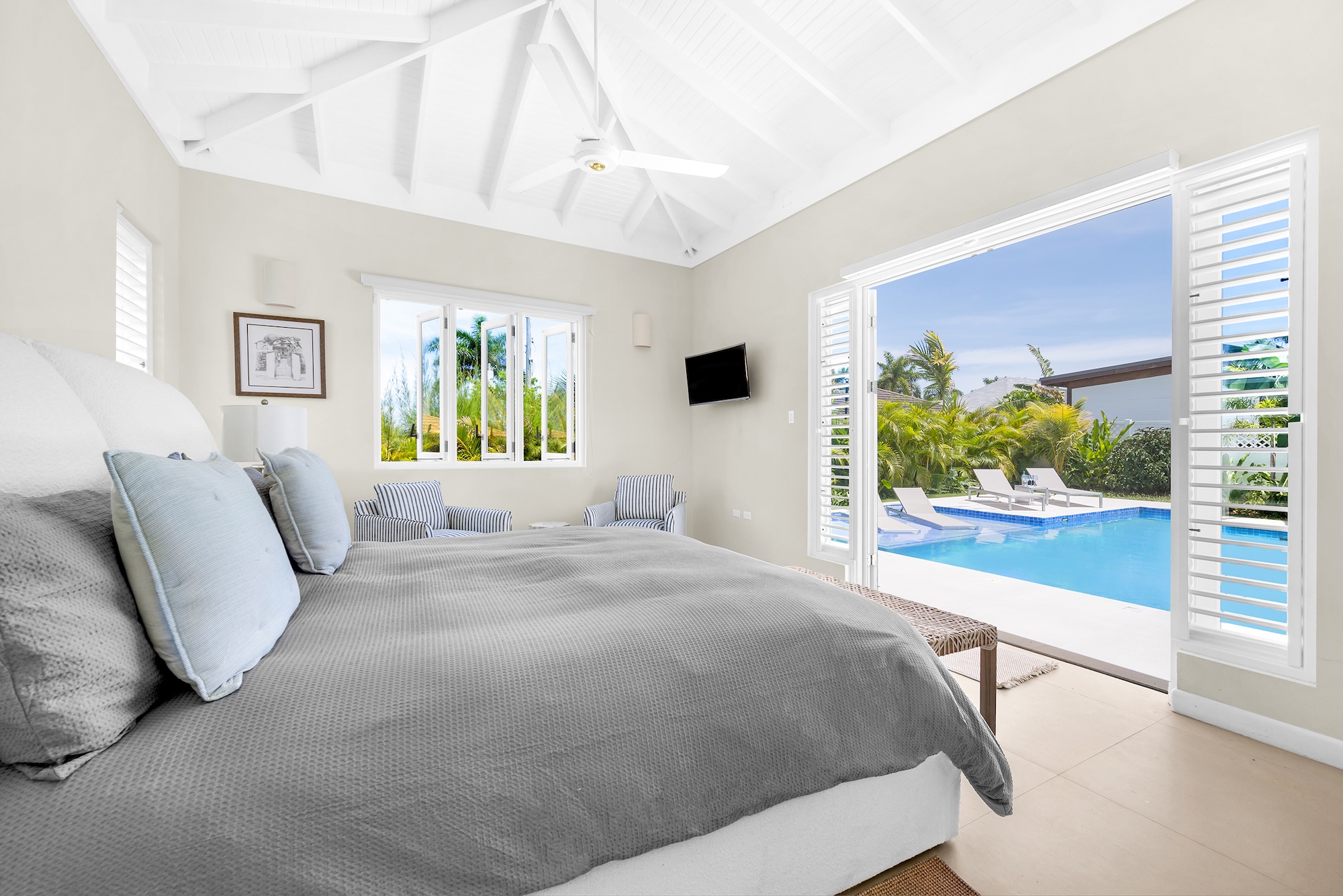 Sea Swept Villa is a spacious, modern four-bedroom vacation rental designed for easy living. Featuring an air-conditioned great room, spacious bedrooms, and luxurious bathrooms. Days center around the private pool and shaded verandah, with a barbecue, outdoor shower, and a spiral staircase to a breezy roof deck for sunset dinners with palm-top views to the sea and hills. Your cook and housekeeper handle meals and laundry, Wi-Fi reaches every room, and, if needed, a whole-house generator keeps everything running. It’s an easy walk to Silver Sands Beach.