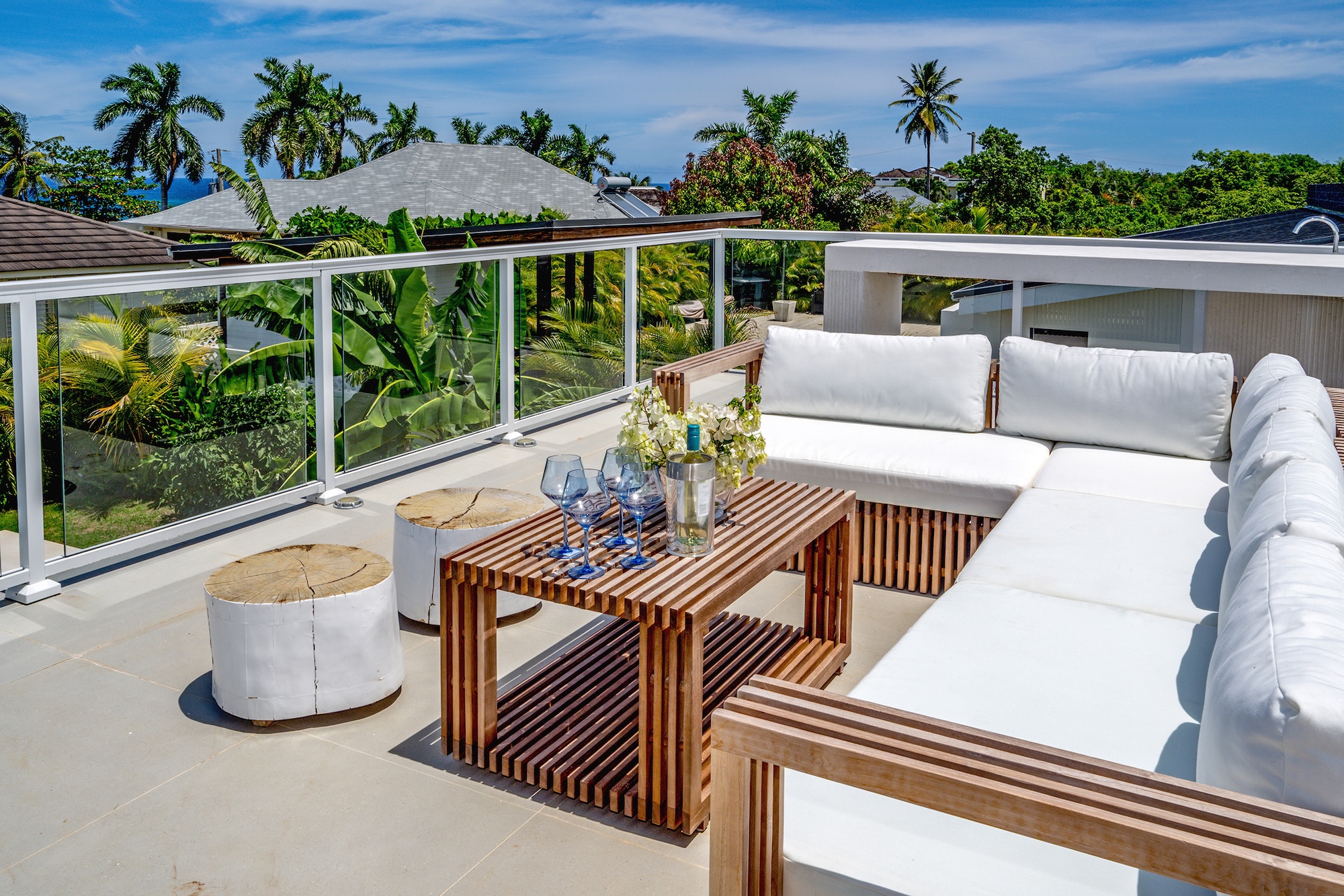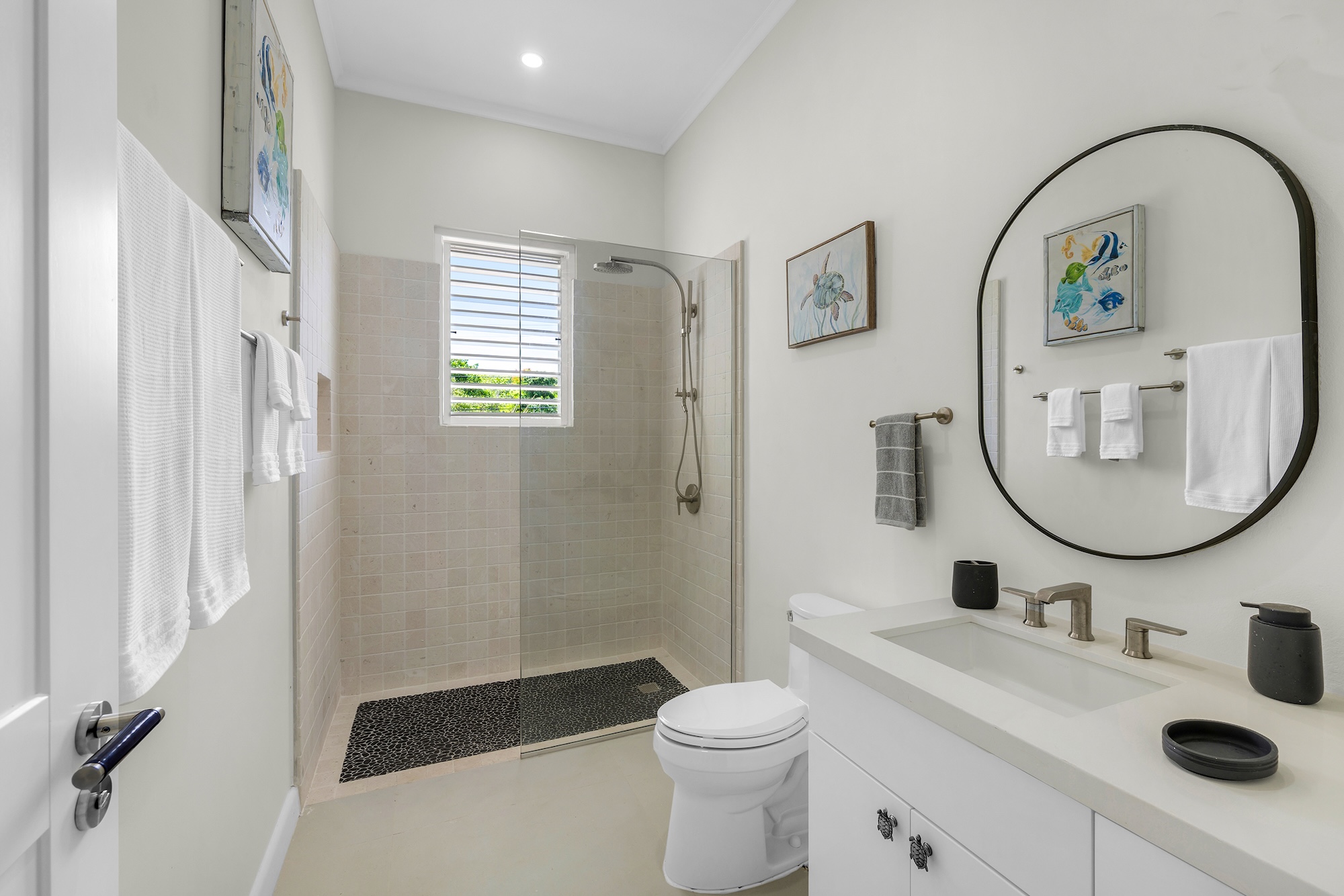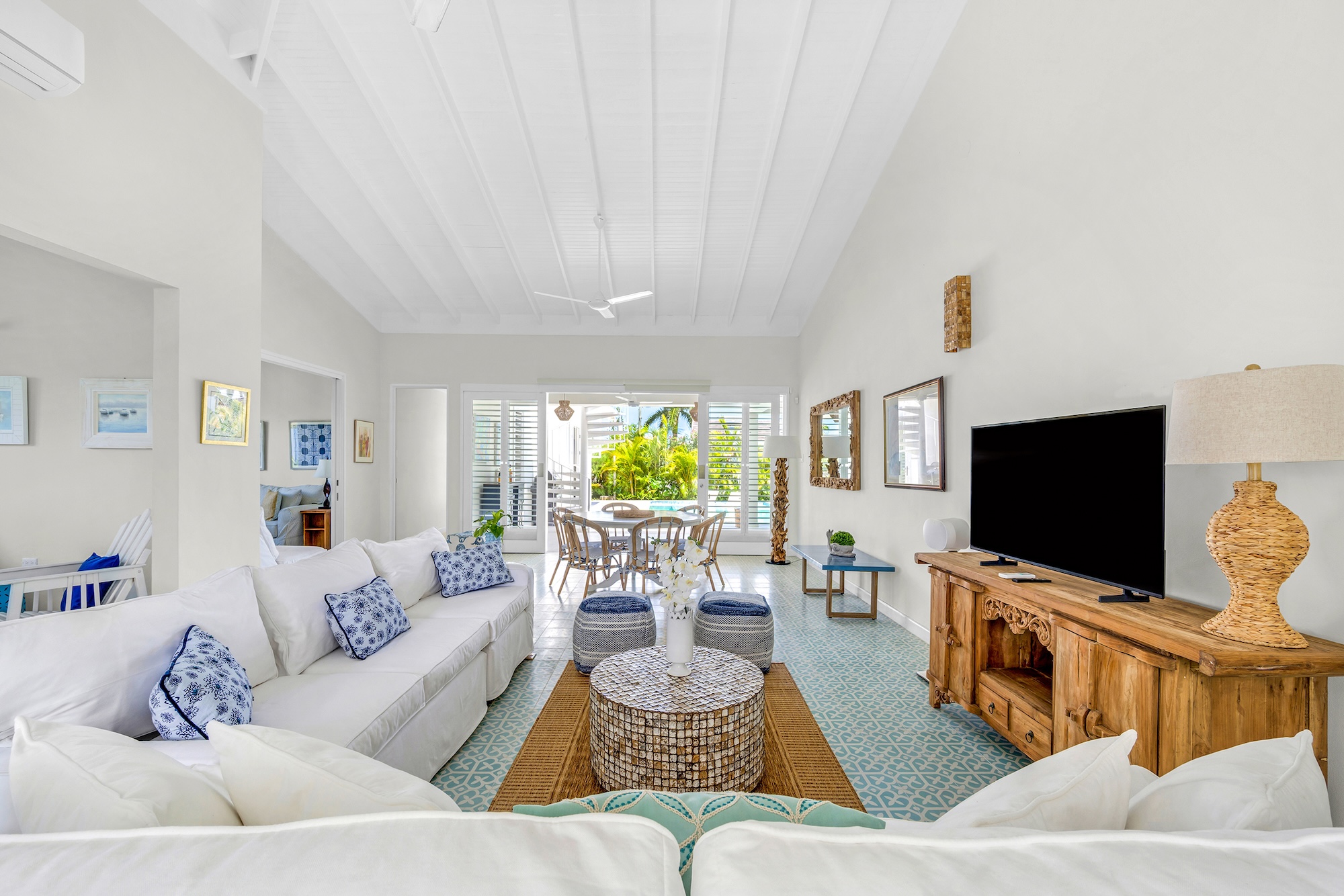 Sea Swept Villa is a spacious, modern four-bedroom vacation rental designed for easy living. Featuring an air-conditioned great room, spacious bedrooms, and luxurious bathrooms. Days center around the private pool and shaded verandah, with a barbecue, outdoor shower, and a spiral staircase to a breezy roof deck for sunset dinners with palm-top views to the sea and hills. Your cook and housekeeper handle meals and laundry, Wi-Fi reaches every room, and, if needed, a whole-house generator keeps everything running. It’s an easy walk to Silver Sands Beach.