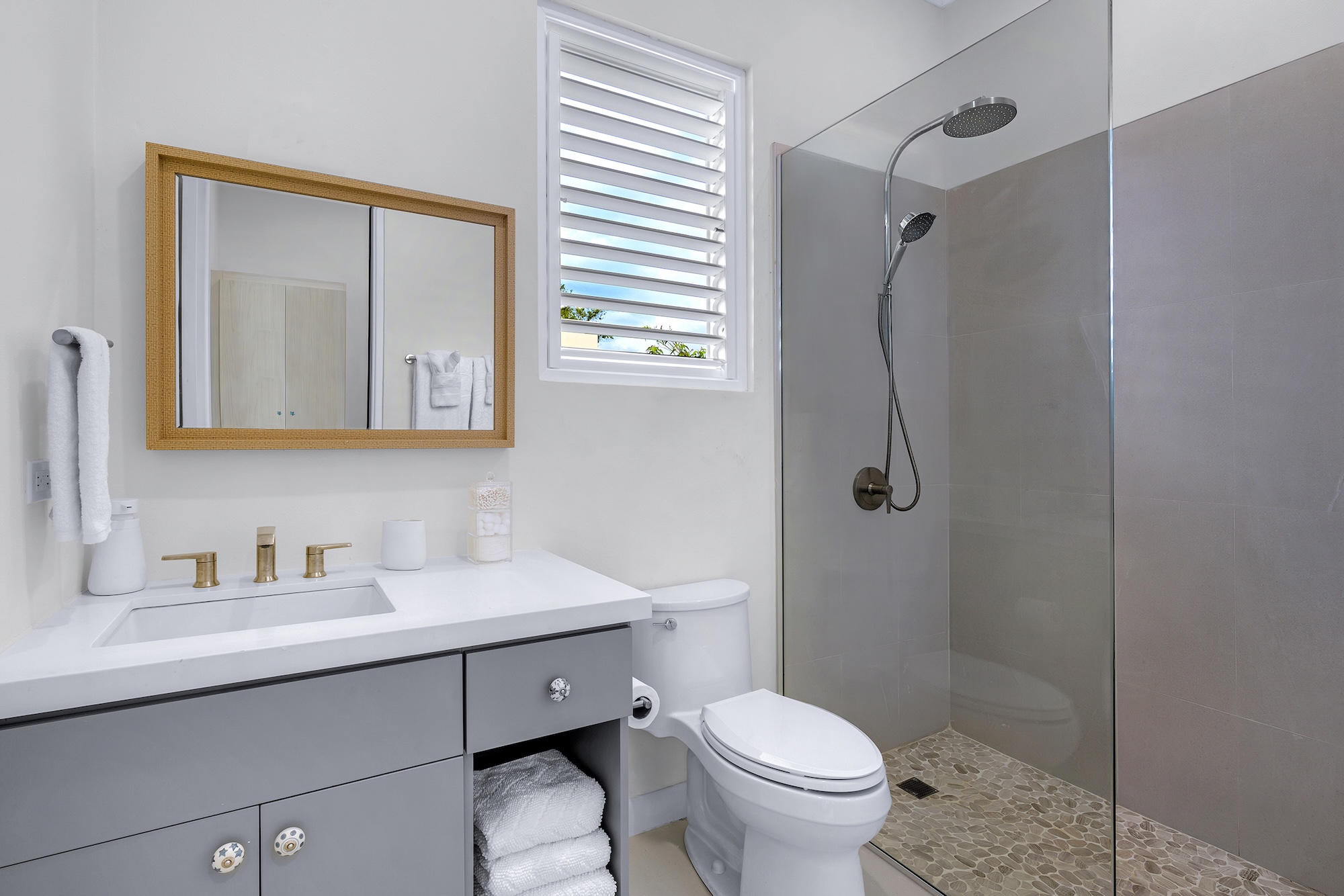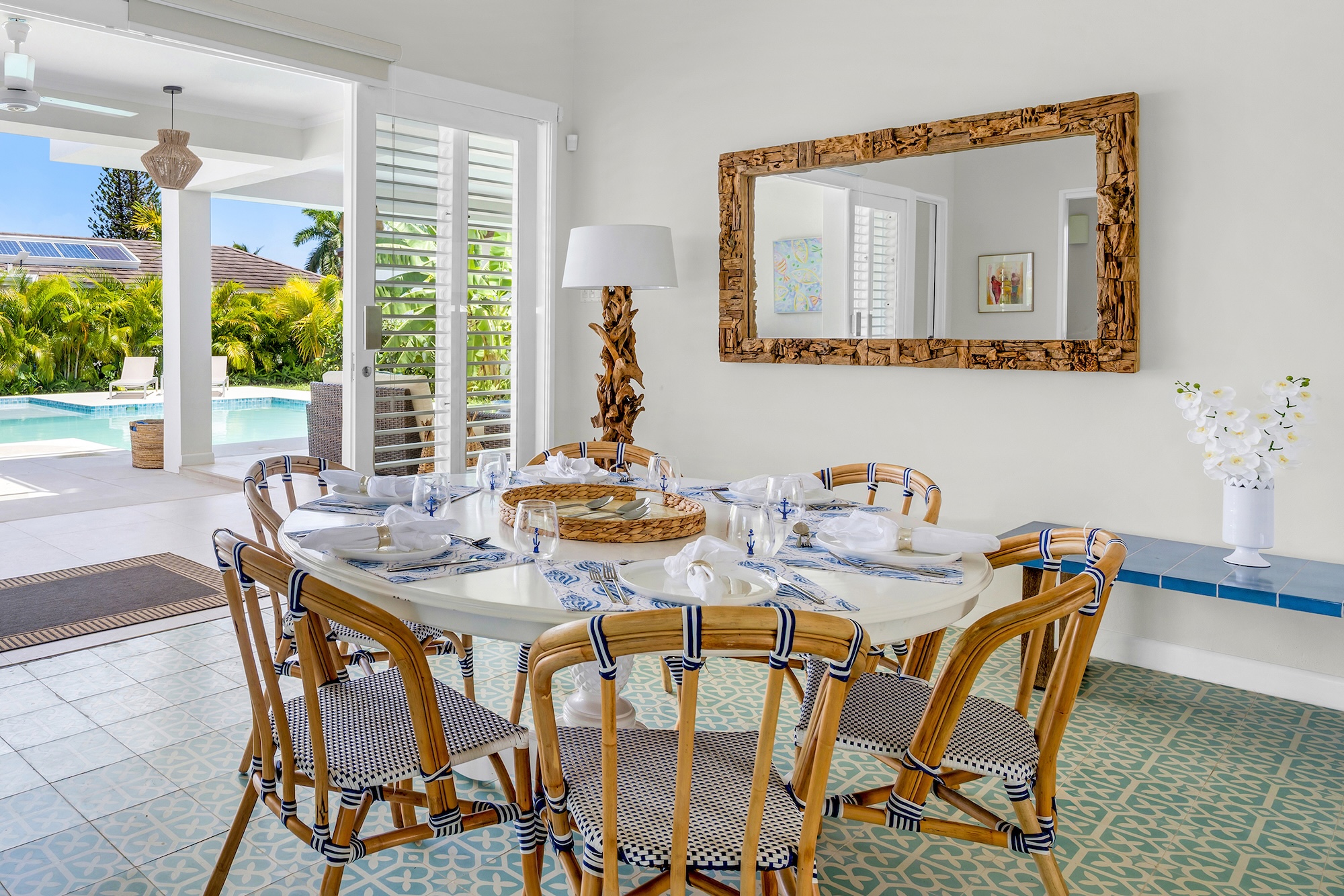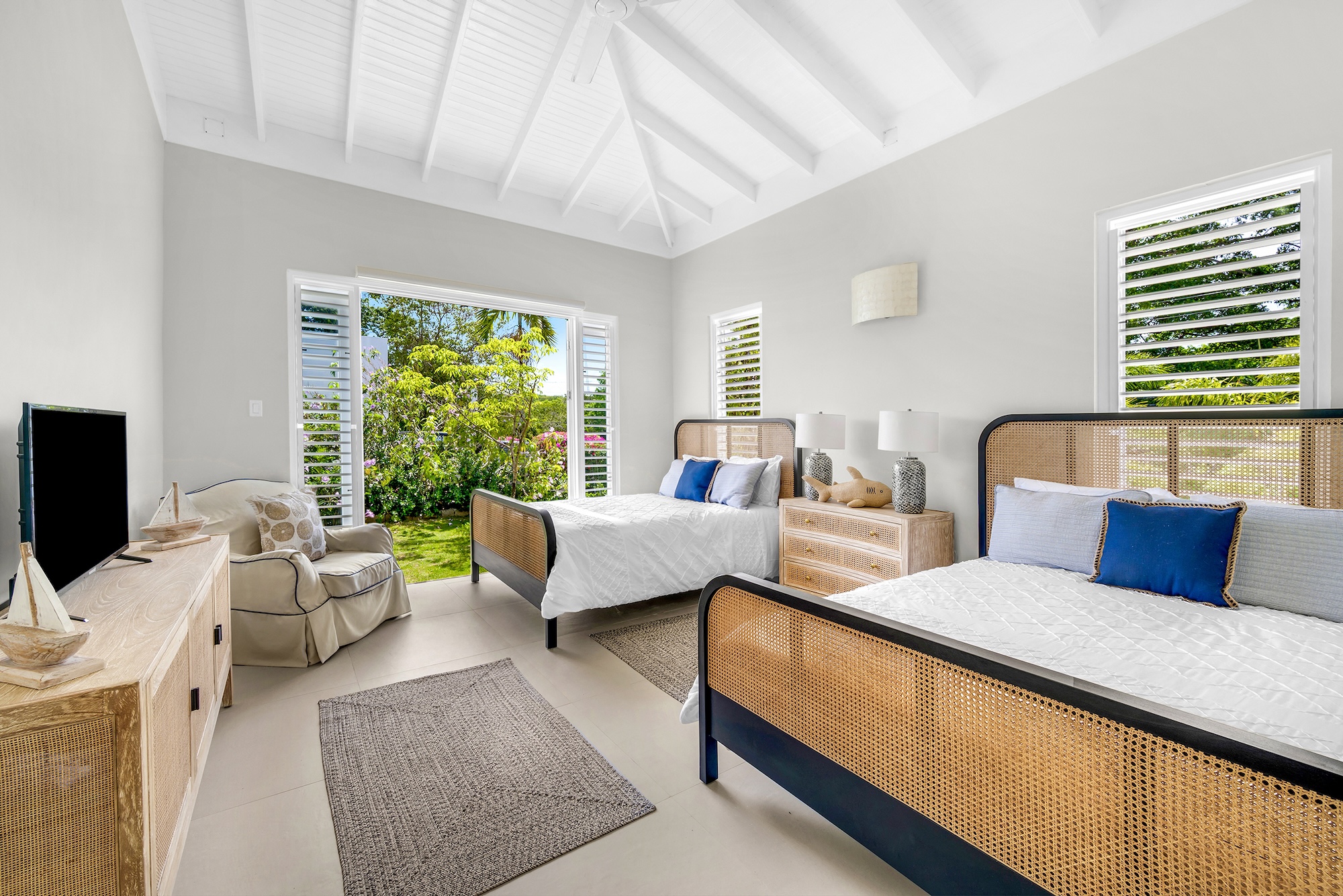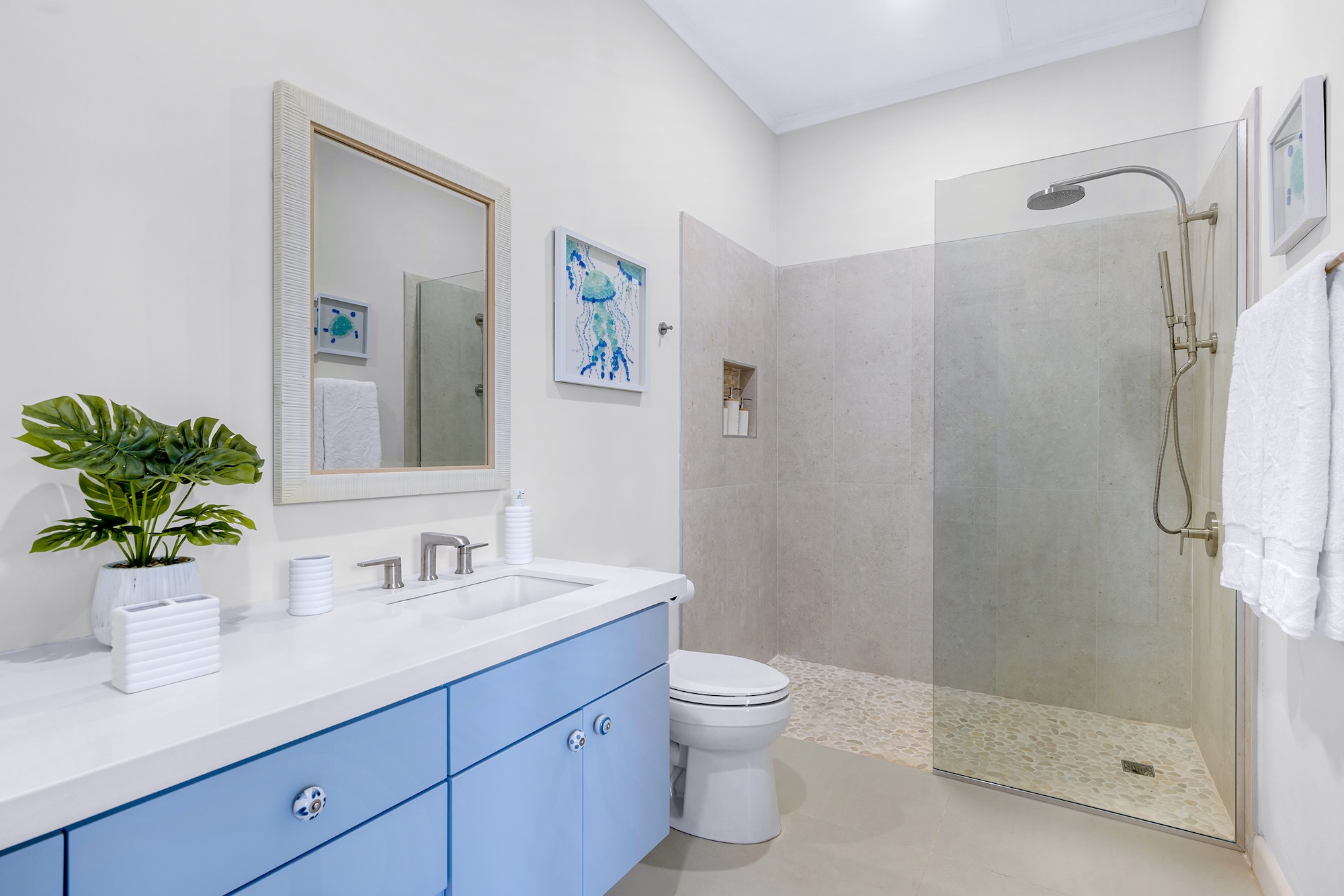 Sea Swept Villa is a spacious, modern four-bedroom vacation rental designed for easy living. Featuring an air-conditioned great room, spacious bedrooms, and luxurious bathrooms. Days center around the private pool and shaded verandah, with a barbecue, outdoor shower, and a spiral staircase to a breezy roof deck for sunset dinners with palm-top views to the sea and hills. Your cook and housekeeper handle meals and laundry, Wi-Fi reaches every room, and, if needed, a whole-house generator keeps everything running. It’s an easy walk to Silver Sands Beach.