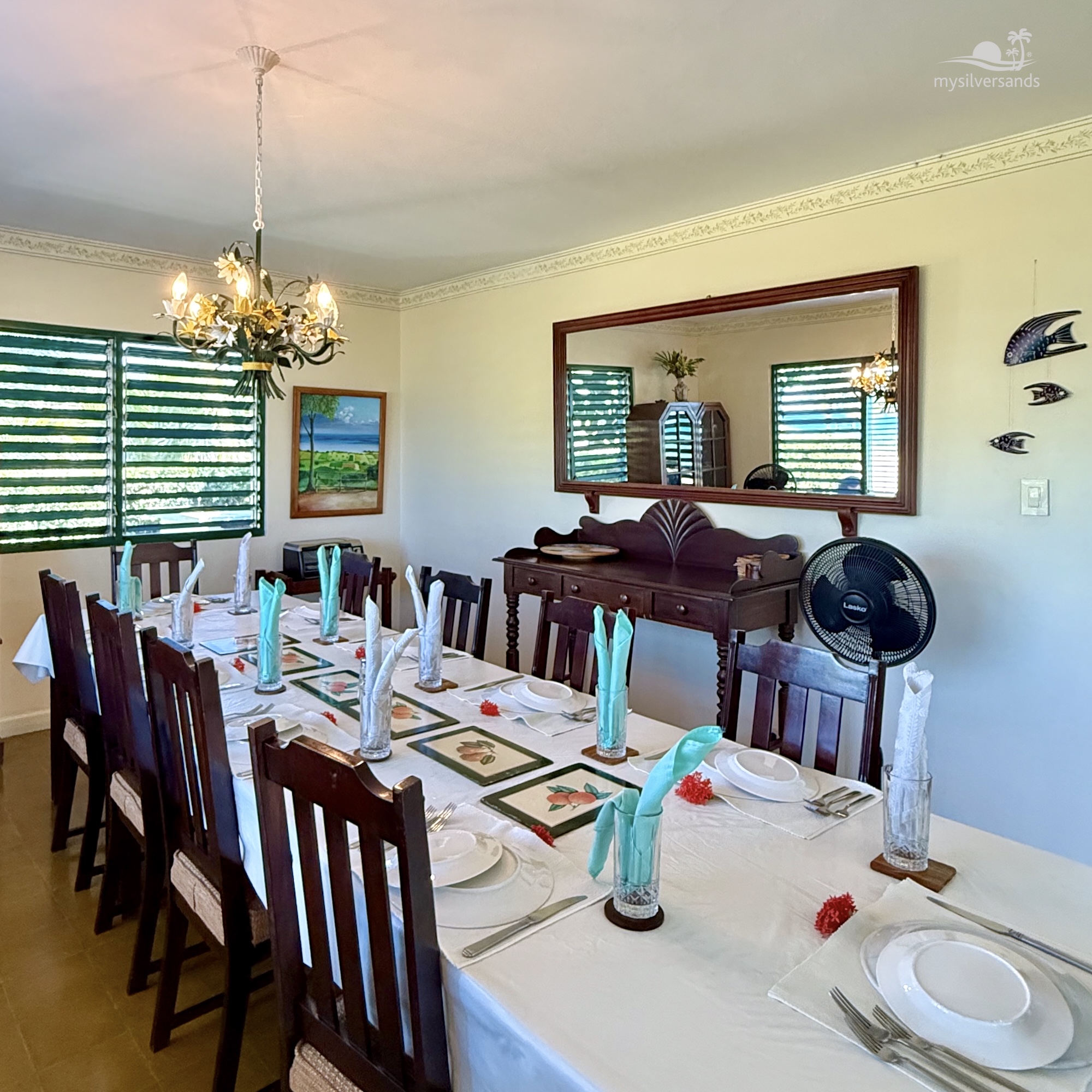 Jamahome is a five bedroom villa (rental as 2, 3, 4, or all 5 bedrooms) sitting about one hundred feet from the Caribbean Sea at Silver Sands Jamaica. Jamahome is a traditional private vacation rental with a cook who will prepare all your meals and a housekeeper who cleans and makes the rooms every day. Located on the Caribbean Sea, the views are spectacular and the swimming beach is less than five minutes walk along quiet private roads within the gated community of Silver Sands Jamaica.